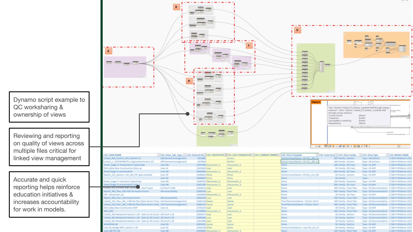 This data is used in Revit to guide WeWork’s modeling efforts as it develops a series of design options. The firm uses Dynamo and Revit API to embed cost and sales data from its business systems in the models in order to analyze revenue versus cost and other key business metrics.